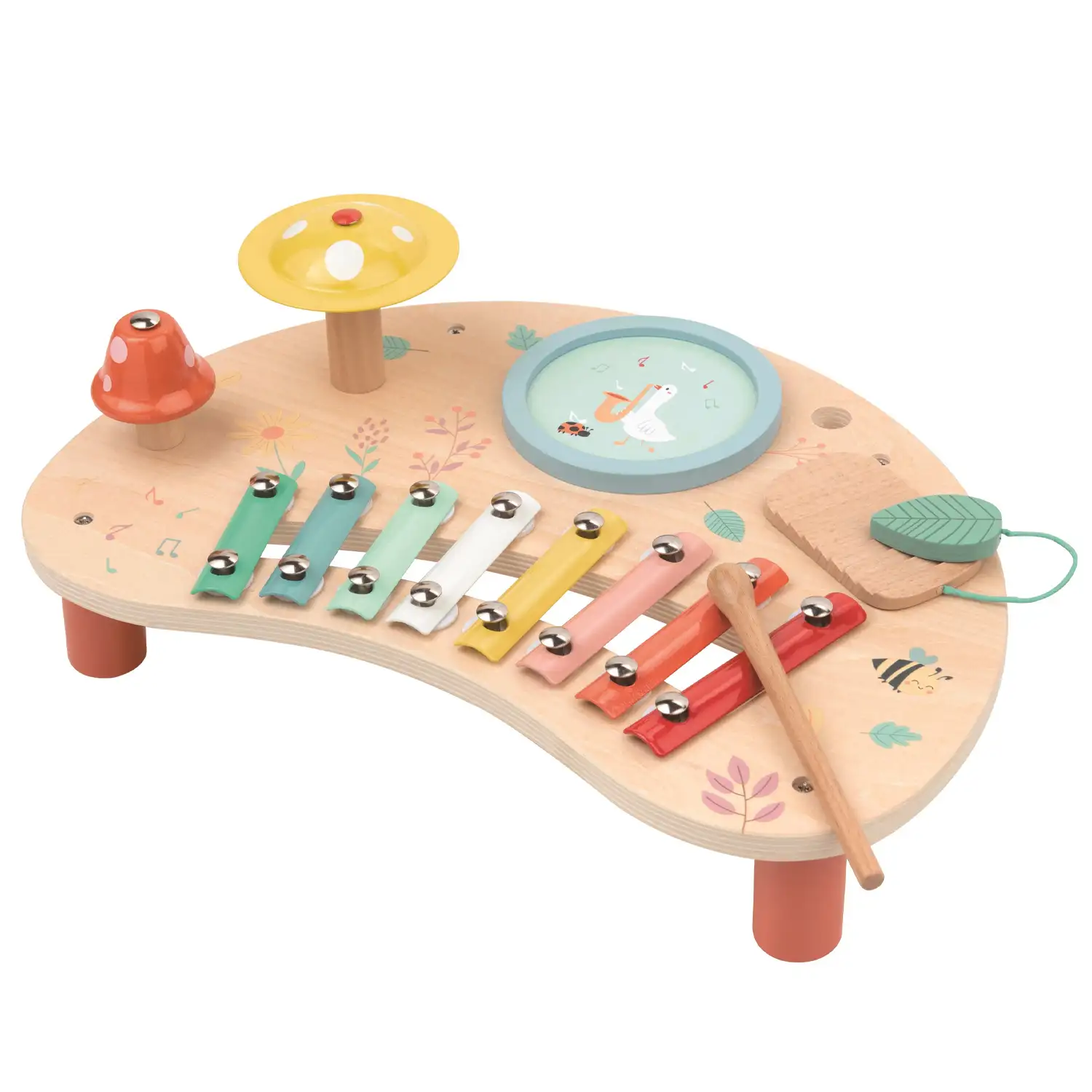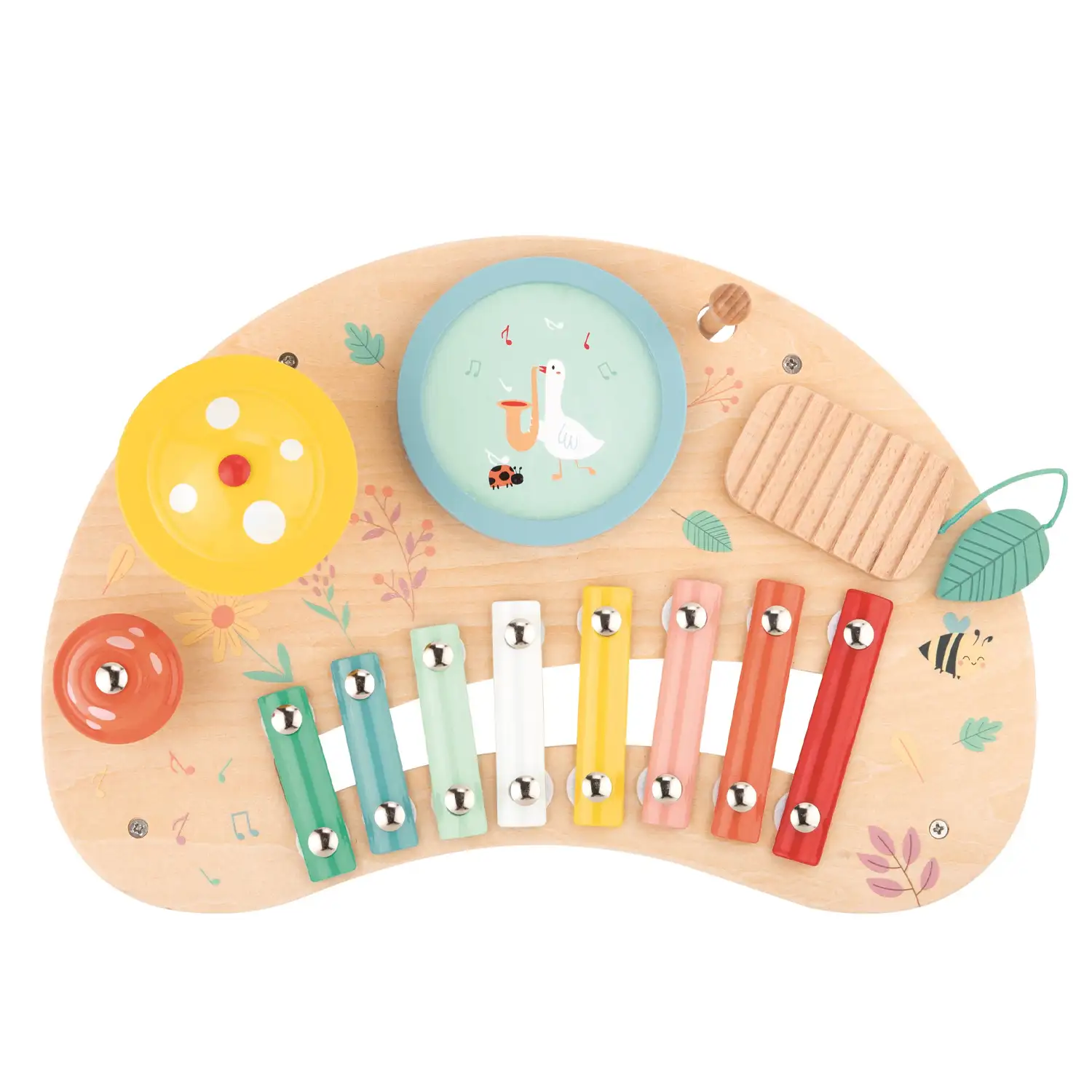 Spielba Musik Tisch mit Xylophon, Trommel und Glocke aus Massivholz und Metall. Fördert die Feinmotorik, Koordination, Rythmus und Gehör Deines Kindes.