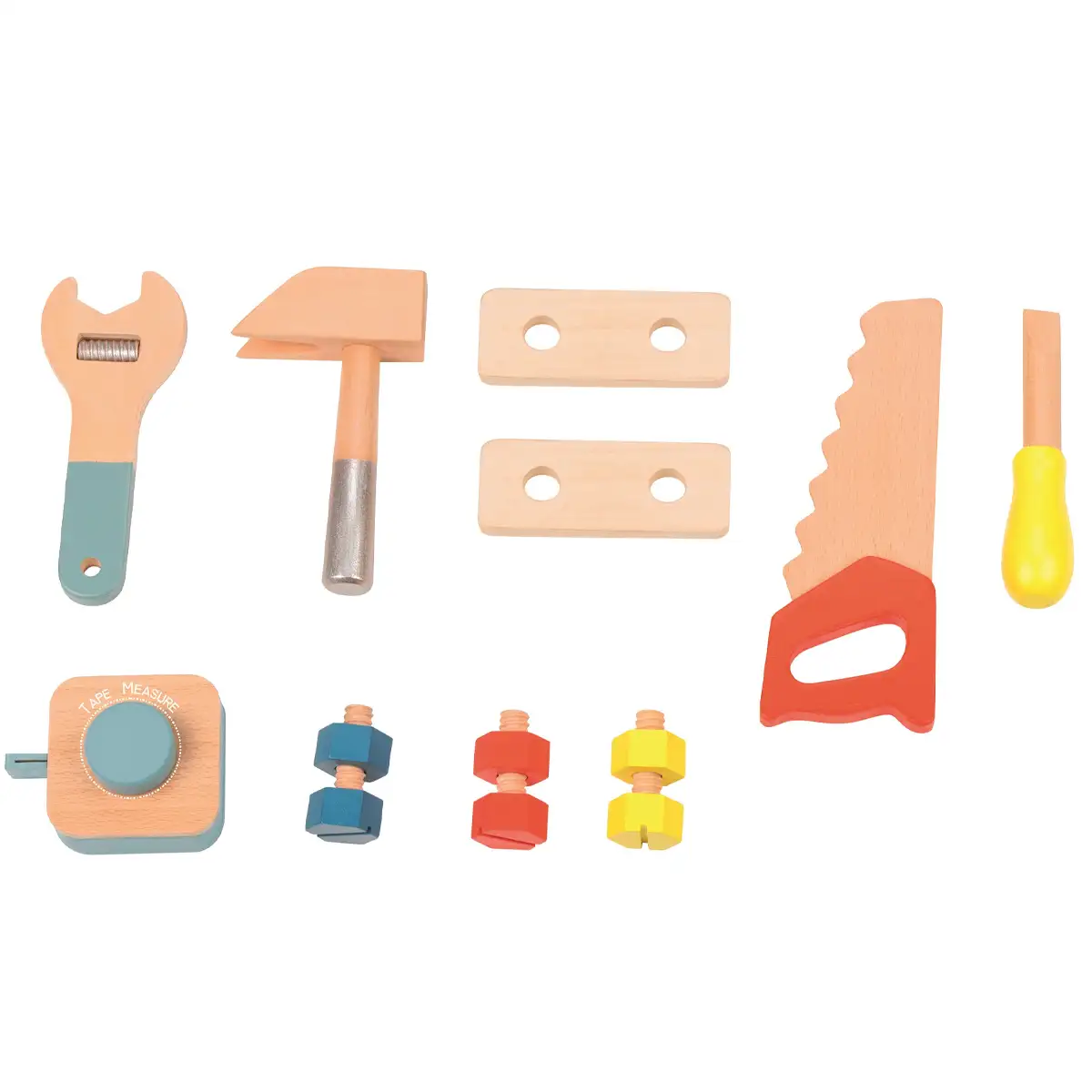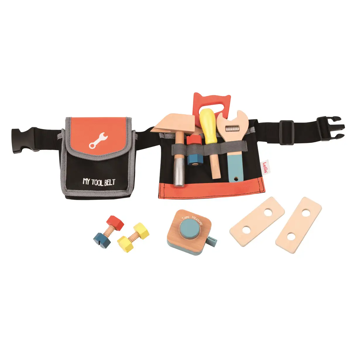 Umfangreicher Werkzeuggürtel für Kinder mit Holzwerkzeug und Zubehör.